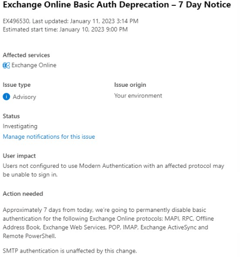 In a few days the basic authentication mode (which could be forced through the portal) will be unavailable. To allow e.g. mail sending from pop3,imap powershell. The advanced authentication mode OAuth2 must be used.