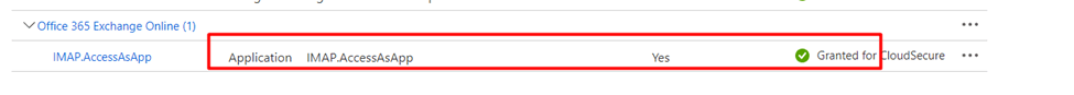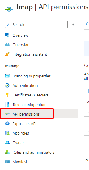 Once the application is created. In the left menu we choose «API permissions» and add permision «Office 365 Exchange Online» – «Applications permisions» – IMAP AccessAsApp